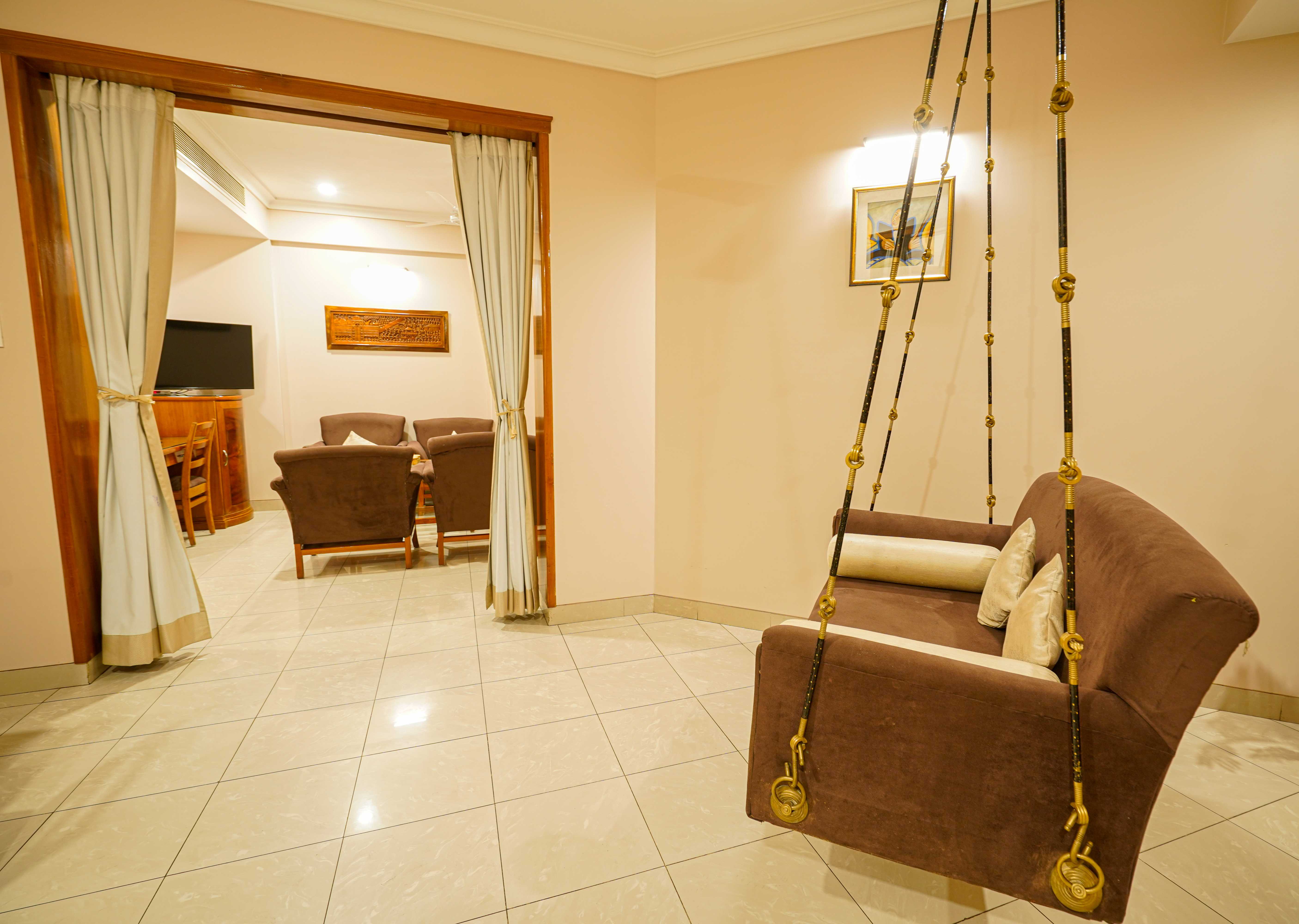 Two state of the art rooms elegantly designed for corporate travellers. Both these rooms sport a richly crafted “Jhula” to give our guests an unperturbed experience of a home. This three room suite is remarkably designed to enhance guest comfort, with two bathrooms and a living room.